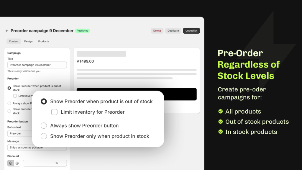 You have full control! You can enable Shopify preorders for specific products, entire collections, or all products in your store through the app settings. Customize it to perfectly fit your campaign.