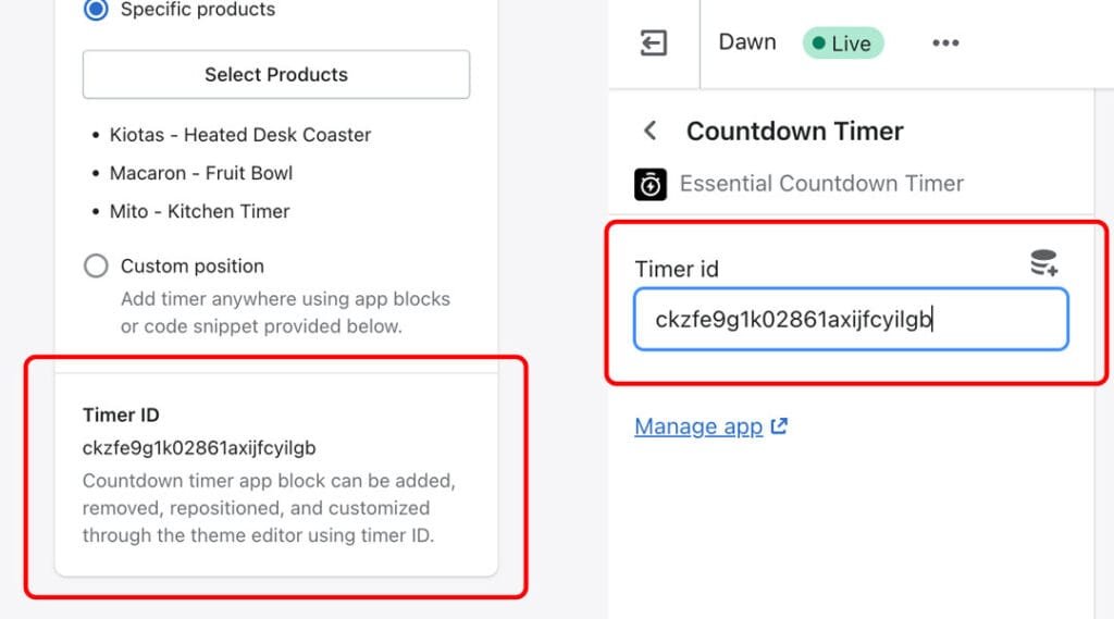 5. Now you should see the countdown timer app block added to your product section. Click on it. This is where you’ll need to add the ID of the timer you want to display in this position. You can find the timer ID in our application under the “Placement” tab. Copy it to the countdown app block in the theme editor you created during the previous steps.