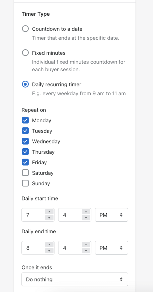 In the content configuration step, you have full control over the appearance and functionality of your countdown timer. Set the days on which you want the timer to be shown or repeated. For instance, if you operate from Monday to Friday, unselect Saturday and Sunday. Specify your daily start and end times, ensuring they accurately reflect your working hours. Choose the action you want to take place once the timer ends, such as hiding the timer.