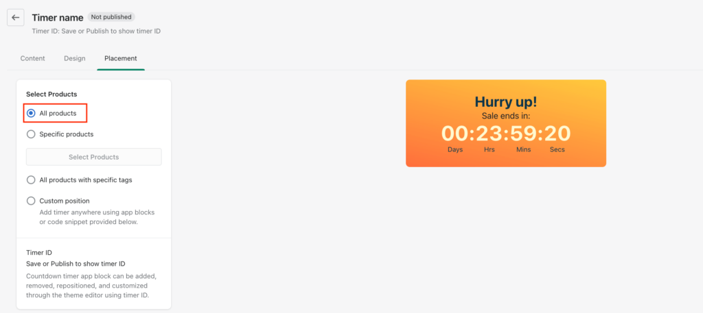 Next, you’ll determine where the countdown timer will be placed on your product pages. Essential Apps offers several options, including displaying the timer on all products, specific products, products with specific tags or custom position. For now, let’s go with the classic option and display the timer on all products.