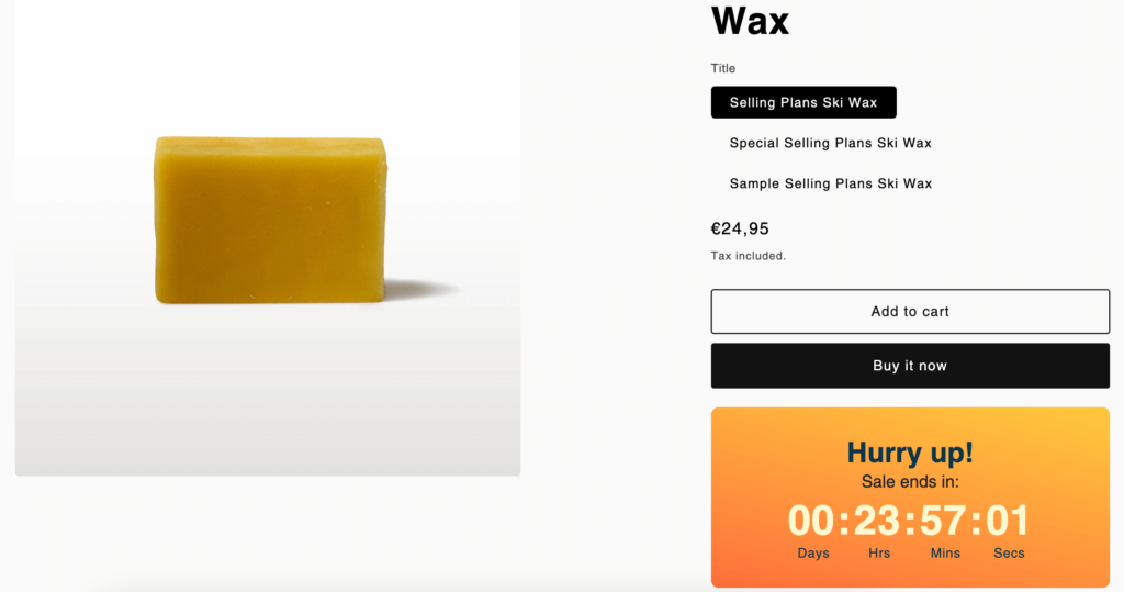A Shopify product countdown timer is a visual timer displayed on your product pages that counts down to a deadline. It creates urgency and encourages shoppers to complete their purchase before time runs out.