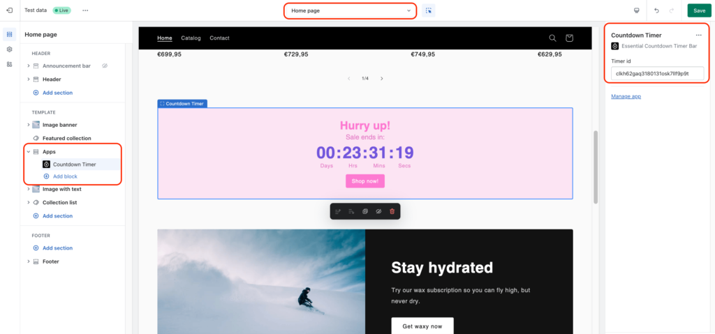 Use Theme Editor to add your timer to your Shopify store. Click on “Add section,” choose the countdown timer, and double-click to insert your timer ID from the settings. Adjust the timer’s position on your homepage as needed.
